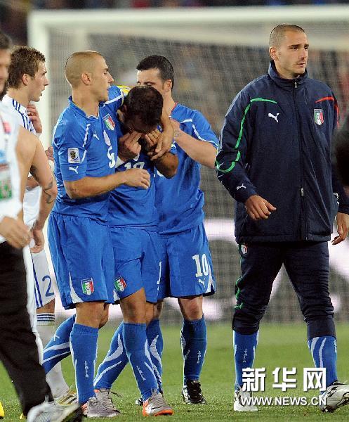 6月24日,意大利隊球員夸利亞雷拉(右三)賽后傷心不已。當日,在約翰內斯堡埃利斯公園球場進行的南非世界杯F組第三輪比賽中,意大利隊以2比3負于斯洛伐克隊,無緣16強。新華社記者王毓國攝