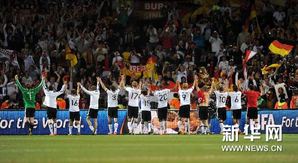 6月27日,德國隊球員在比賽后向球迷致意。當日,在布隆方丹舉行的2010年南非世界杯八分之一決賽中,德國隊以4比1戰勝英格蘭隊,進入八強。新華社記者李尕攝