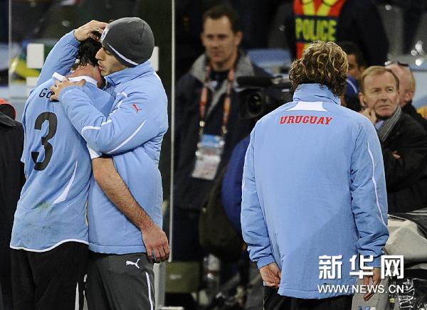 7月6日,烏拉圭隊(duì)球員路·蘇亞雷斯(左二)安慰隊(duì)友迭·戈丁。當(dāng)日,在開普敦舉行的2010南非世界杯半決賽中,烏拉圭隊(duì)以2比3不敵荷蘭隊(duì),無(wú)緣決賽。新華社/路透