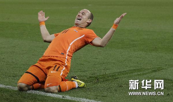 7月6日,荷蘭隊(duì)球員羅本慶祝進(jìn)球。當(dāng)日,在開普敦舉行的2010南非世界杯半決賽中,荷蘭隊(duì)以3比2戰(zhàn)勝烏拉圭隊(duì),挺進(jìn)決賽。 新華社/路透