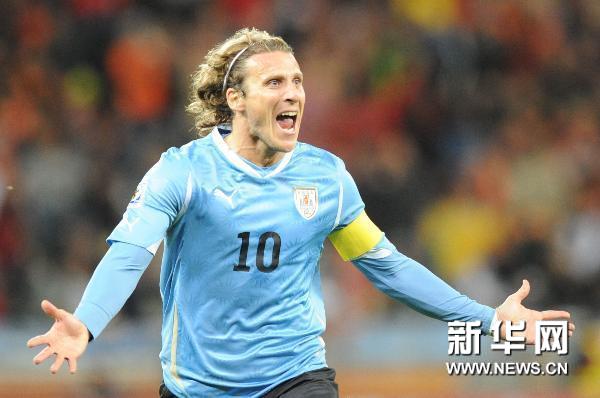 7月6日,烏拉圭隊(duì)球員迭·弗蘭慶祝進(jìn)球。當(dāng)日,在開普敦舉行的2010南非世界杯半決賽中,荷蘭隊(duì)3比2戰(zhàn)勝烏拉圭隊(duì)。 新華社/法新