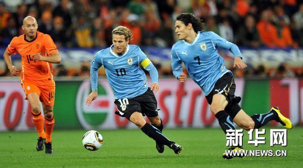 7月6日,烏拉圭隊(duì)球員迭·弗蘭(右)帶球突破。當(dāng)日,2010年南非世界杯半決賽第一場(chǎng)比賽在開普敦綠點(diǎn)球場(chǎng)舉行,荷蘭隊(duì)3比2戰(zhàn)勝烏拉圭隊(duì)。新華社記者楊磊攝