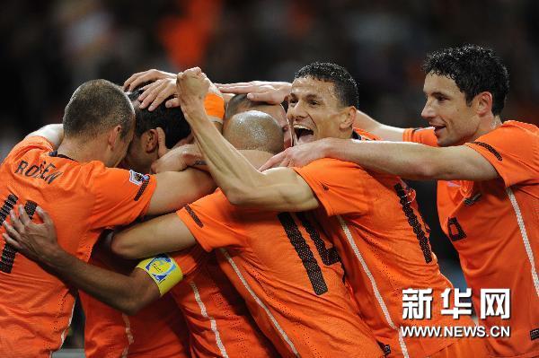 7月6日,荷蘭隊(duì)球員范布隆霍斯特進(jìn)球后與隊(duì)友慶祝。當(dāng)日,在開普敦綠點(diǎn)球場(chǎng)舉行的2010南非世界杯足球賽半決賽中,荷蘭隊(duì)3比2戰(zhàn)勝烏拉圭隊(duì)。新華社記者陳海通攝