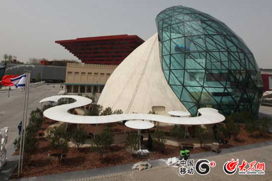 記者在現場看到,以色列展館由兩座流線型建筑體組成,似環抱在一起的雙手,又似一枚海中的貝殼。兩座建筑體分別由原石和玻璃建造,巧妙融合在一起。設計師哈伊姆?多頓談到他的設計理念時說:“由原石建造的部分代表了歷史,代表著猶太人的根和我們的過去。而由玻璃構成的建筑部分,則象征著今天嶄新的以色列,一個在多個領域享有盛譽、清澈而有朝氣的國度。”