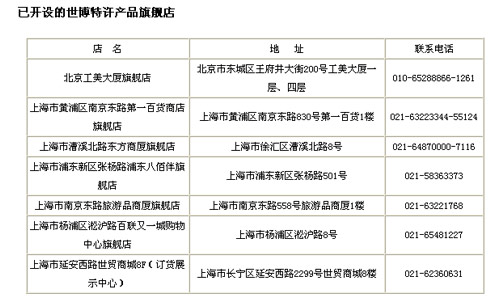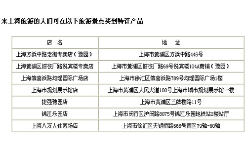 消費者要購買世博特許產品,可通過實體銷售和無店鋪銷售等多種渠道。其中:實體銷售有旗艦店(團購展示中心)、全品店(形象店)、專賣店、專柜(架)四種銷售網點;無店鋪銷售有網絡銷售和電視購物兩種銷售方式。目前,世博特許商品銷售點已經遍及全國31個省市區,銷售點總數突破4000家(包括貴金屬及普通商品的零售點),其中旗艦店(團購展示中心)7家,開設在上海市的有1000家。隨著世博會的臨近,特許產品經營網點還將不斷增加。5月1日前,世博園區內將有80個零售點開業。由于特許產品品類很多,每家商店不可能經營所有產品,一般旗艦店(團購展示中心)的商品相對而言是最多的。旗艦店還帶有團購功能,需要團購的可與旗艦店進行接洽。