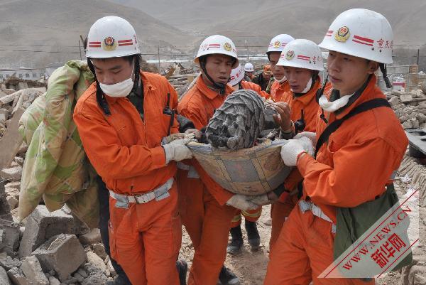 當日上午10時25分,在地震廢墟下被困近51個小時的澤仁多吉,被來自重慶的消防救援隊成功救出,目前他已經被送往西寧進行醫治,沒有生命危險。“4·14”玉樹地震發生后,重慶消防總隊200多名官兵輾轉千里到達玉樹災區,他們攜帶生命探測儀、搜救犬等全力救援受災群眾。新華社發(陳顯斌攝)