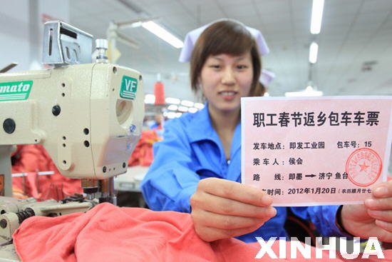 [提要] 春節前夕,青島即發集團成立專門的春運小組,包租大巴、自制車票,免費送該企業山東省內的2000多名外來務工人員回家過年。據悉,這些外來務工人員將于1月20日(臘月27日)乘坐專車返鄉。 1月16日,一名青島的外來務工人員展示回家過年的免費車票