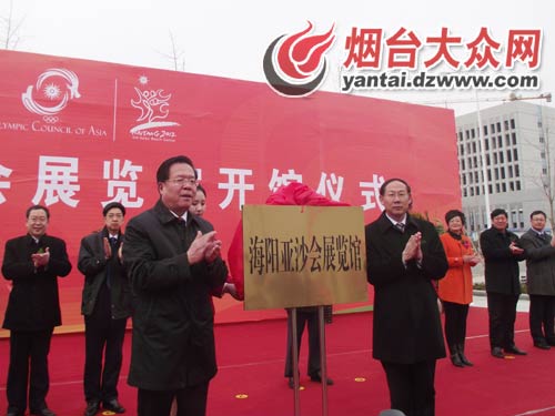 開館儀式由海陽市委副書記李波主持。組委會執(zhí)行局總干事、海陽市市長姜仕禮在儀式上致辭。組委會執(zhí)行局成員、煙臺市政府副市長張廣波和組委會執(zhí)行局成員、海陽市委書記王玉波共同為亞沙會展覽館揭牌。