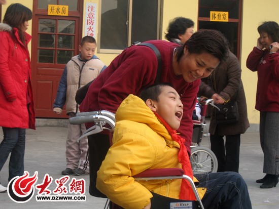 濟寧安利志愿者孔黎教特教學生調試輪椅