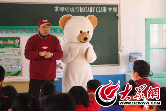 志愿者馬站英(左)、侯召亮(右)在濟南劉家慈安小學和小朋友們互動