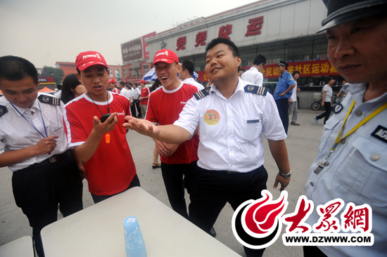 濟(jì)南長途汽車站游戲中,當(dāng)志愿者報(bào)出成績后,自信的選手向?qū)κ痔魬?zhàn)