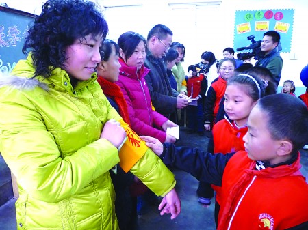 16日下午,濟南市德興街小學開展了“家校聯動共保學生平安”活動,成立家校聯動治安小組。記者在現場看到,在該校三年級一班的教室里,來自一年級到六年級的20位家長代表在家校聯動治安小組協議書上簽名。學生向各年級的家長發放了家校聯動服務卡,服務卡上印有學校校長室的電話和振興街派出所的電話,并給家長戴上了印有“家校巡防”字樣的黃袖章(右圖)。槐蔭區公安分局振興街派出所的民警也來到活動現場,并向小學生們一一發放了振興街派出所110便民服務卡,服務卡上寫有報警服務電話。據振興街派出所姜警官介紹,如果學生在學校以及校園周邊遭遇不法行為,可以撥打服務卡上的電話,派出所將會第一時間出警,保障學生的人身財產安全。
