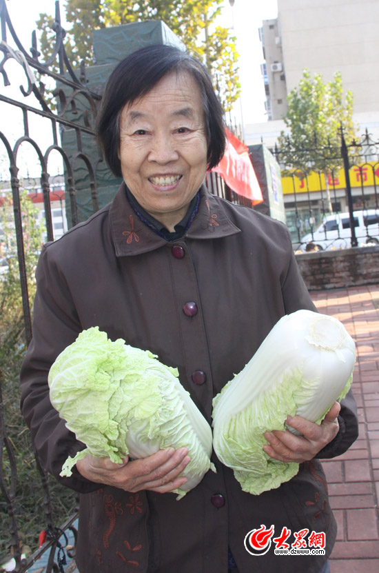 經(jīng)過宋玉祥夫婦在小區(qū)里宣傳,鄰居李大媽也來買白菜獻(xiàn)愛心(記者 王磊 攝)