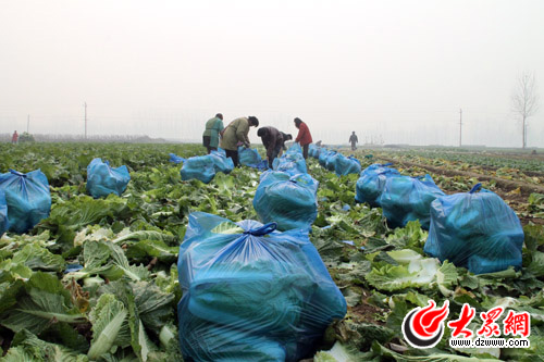 早上8點,張貼著“根植大眾 服務(wù)大眾”的10輛汽車從山東報業(yè)大廈出發(fā),向著歷城區(qū)唐王鎮(zhèn)南殷村駛?cè)ァ?jù)了解,11月17日,大眾報業(yè)(集團(tuán))發(fā)行有限公司響應(yīng)大眾網(wǎng)發(fā)起的“今冬請吃愛心菜”活動,在唐王鎮(zhèn)南殷村訂下50000萬斤愛心菜。今天,發(fā)行公司副總經(jīng)理冀魯向菜農(nóng)兌現(xiàn)承諾,率領(lǐng)公司車隊來到南殷村,將首批37000斤愛心菜從地頭拉走。上午9點,南殷村村西面的菜地里一片繁忙景象。7戶菜農(nóng)正忙著砍菜、掰幫、裝袋、過磅,一袋袋干干凈凈的大白菜被整齊地裝上汽車。