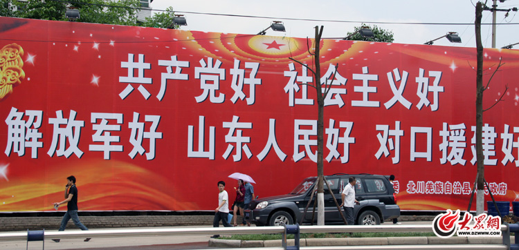 “重建家園、面向未來”,“在災難中崛起,在重建中振興,在和諧中發展”,在北川一條條催人奮進的標語隨處可見。北川擂鼓鎮,廢墟旁矗立的十幾臺塔吊正在緊張工作;新北川產業園內,五星紅旗下,面帶微笑的建筑工人在密如森林的鋼筋中,壘著一塊塊紅磚。山東援建的新北川正在崛起。