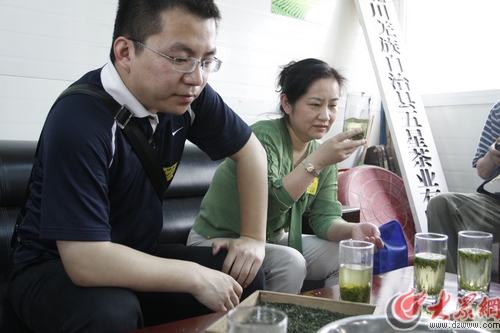 山東愛心企業代表不乏懂茶之人,圖為山東省體育彩票管理中心何珊(女)和中國農業銀行山東分行題召棟在茶企工廠品鑒北川茶