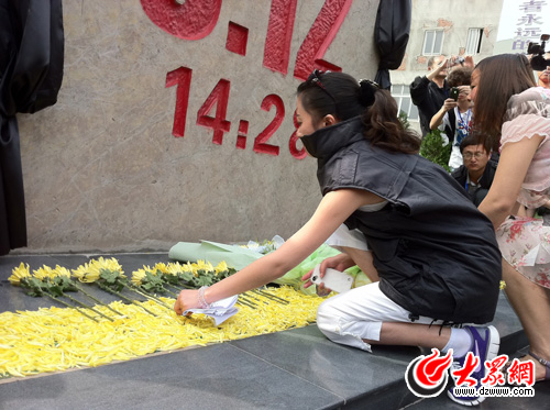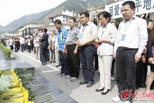 山東愛心企業代表在“5.12”大地震遇難者紀念碑前致哀。從左至右為:農業銀行山東分行題召棟、山東省體育彩票管理中心何珊、大眾網副總編姜長勇、中國建設銀行山東省分行于福貴、山東省體彩管理中心朱華品