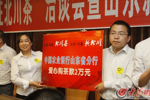 洽談會(huì)上,山東省體育彩票管理中心、中國(guó)建設(shè)銀行山東省分行、中國(guó)農(nóng)業(yè)銀行山東省分行等多家企業(yè)代表與北川佛泉、羌山雀舌、俏泉、五星、禹露等茶葉企業(yè)現(xiàn)場(chǎng)簽訂購(gòu)茶合同,合計(jì)購(gòu)茶超過(guò)60萬(wàn)元,其中山東省體育彩票管理中心購(gòu)茶40萬(wàn)元。為表達(dá)對(duì)山東媒體及企業(yè)的感激,北川茶葉企業(yè)代表分別向媒體和企業(yè)贈(zèng)送了錦旗。