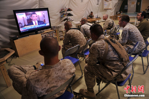 美國總統(tǒng)奧巴馬在當?shù)貢r間5月1日發(fā)表全國電視演講,宣布“基地”組織領導人奧薩馬·本·拉登已被打死。圖為駐阿美軍某團士兵關注奧巴馬演講的電視新聞。圖片來源:中新網(wǎng)