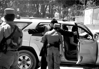 ▲5月2日,美國駐阿富汗大使館安保人員加強戒備,盤查過往車輛。 新華社發