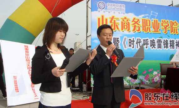 山東商務職業學院的老師和同學一起誦讀《時代呼喚雷鋒精神》。