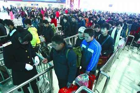 昨日,火車北站,旅客排隊通過檢票口進站。
