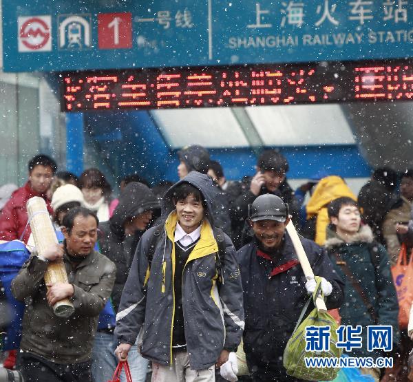 1月18日,旅客正冒雪前往上海火車站乘車。為期40天的2011年春運(yùn)將于1月19日正式啟動(dòng)。春運(yùn)期間,全國(guó)旅客運(yùn)量預(yù)計(jì)將達(dá)到28.53億人次,比上年春運(yùn)增長(zhǎng)11.6%,全國(guó)鐵路預(yù)計(jì)發(fā)送旅客2.3億人次,同比增加2554萬人次,增長(zhǎng)12.5%。新華社記者 裴鑫攝