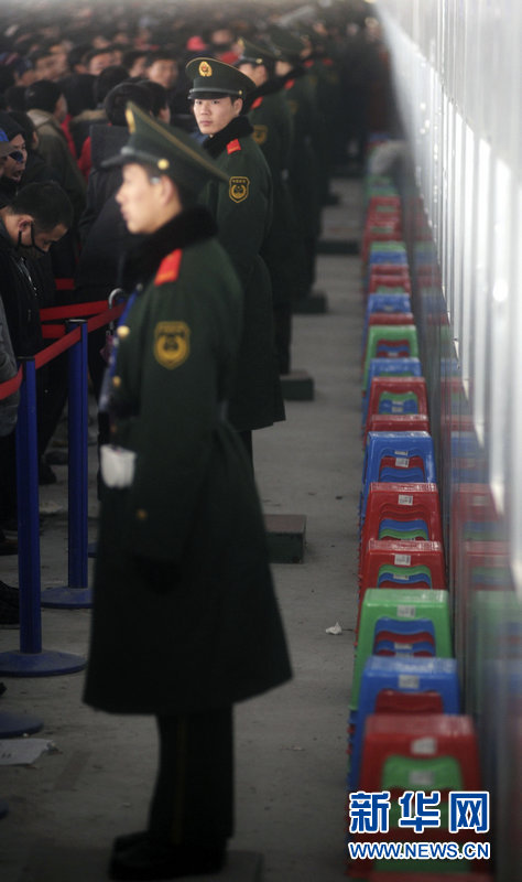 這是1月19日在鐵路上海站春運售票“大賣場”拍攝的售票窗口前擺放的板凳。當(dāng)日是2011年春運首日,鐵路上海站春運售票“大賣場”在每個售票窗口前加設(shè)板凳,使旅客能坐著買票,免受彎腰低頭之累。 新華社發(fā)