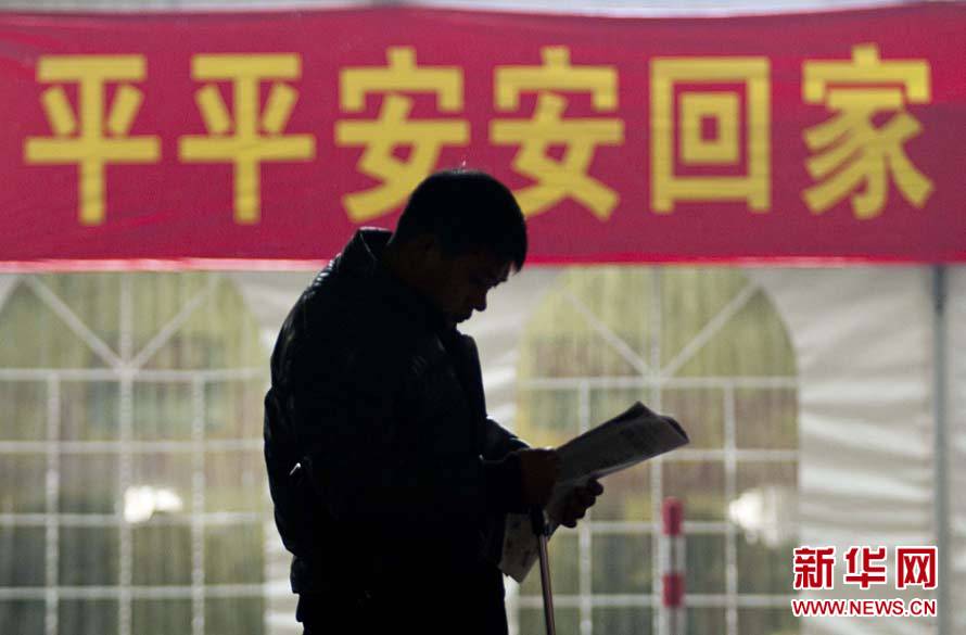 1月19日,一名旅客在浙江杭州城站火車站臨時(shí)候車大廳瀏覽報(bào)紙,等候列車。2011年春運(yùn)自當(dāng)日開始至2月27日結(jié)束,為期40天。新華社發(fā)