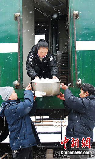 1月18日,一場大雪突降江西九江等地,江西贛北地區(qū)大雪紛飛,一片銀白,江西境內(nèi)的鐵路部門做好車輛防斷檢修和餐車食品供應(yīng)工作,確保人們出行安全暢通。圖為工作人員正在風(fēng)雪中往客車上運(yùn)送餐料食品。胡國林 攝