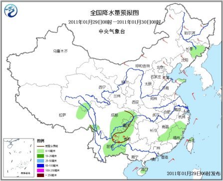 29日08時至30日08時,西藏東部、吉林東部、山東半島東北部、江南東南部、西南地區中東部、海南東部等地有小雪(雨)或雨夾雪,貴州中西部的部分地區有凍雨。內蒙古中東部、東北、華北東部、黃淮東部、東南沿海等地有4~6級風。我國東海及其以南海域有7~8級、陣風9~11級的偏北風。