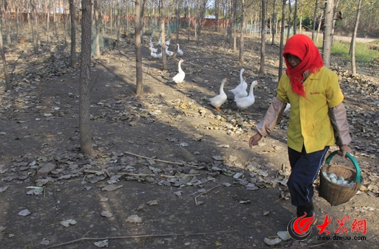 孫立強跟記者介紹說,像他這樣的林下養殖戶在中華埠目前僅有六七戶,他家是村里第一戶開始林下養殖的,村里對林下養殖給予了大力的支持,正在大力推廣。現在孫立強家承包的八十畝林地里養著三千多只雞,百十只美洲雁,近五十只鵝,二十來只鴨,“在林子里放養,喂的都是玉米和豆餅,咱這是純正的綠色生態養殖,雞蛋都是生態雞蛋”,孫立強自豪地說。當記者問起孫立強現在的收入和付出的成本時,他高興地跟記者說起了如今的行情:“土雞蛋現在能賣到十五塊錢一斤,家里養著三千只雞,零散養的美洲雁、鴨子、鵝這些數量不多但是行情都很好,一年能掙到十四五萬,但總共交給村里的土地承包費才不到一萬塊錢。”“那雞蛋的銷量有保障嗎?”聽到記者這個問題,孫立強和旁邊陪同來采訪的村干部都笑了起來,“都搶著來買,純天然的土雞蛋銷路根本不愁,供不應求,供不應求!”聽到這話,記者也跟著樂了。在跟孫立強聊著的時候,孫立強的妻子徐大姐正要提著籃子去林子里撿雞蛋,記者看到便上前與她聊了起來。徐大姐說,母雞下蛋一天最集中的是兩次,上午八點半左右和下午四點半左右,另外上午十點半和下午十二點半她還會再去收一次,“一天下來您要圍著林子走四趟?”記者有些吃驚,“是啊!”邊說著,徐大姐笑著走到近處的雞窩彎下腰就開始拾雞蛋。