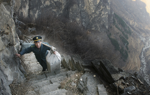 2006年深秋的一天,趙月芳挑了40多公斤的郵包走到半山腰一空地準(zhǔn)備歇腳。