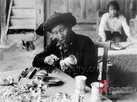 阿昌族藝人制作銀飾。