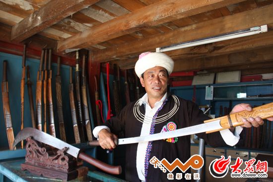 “戶撒刀王”項老賽在他的刀鋪向我們展示他的作品。