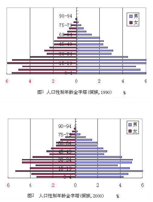從各年齡段的人口比例看,少年兒童人口(0-14歲)比重為 27.79%,勞動年齡人口(15-64歲)比重為66.03%,老年人口(65歲及以上)占6.18%,與1990年相比,少年兒童人口比重下降了4.43個百分點,勞動年齡人口比重和老年人口比重分別增加了2.48和1.95個百分點。1990年和2000年侗族人口的性別年齡結構如圖1和圖2所示。