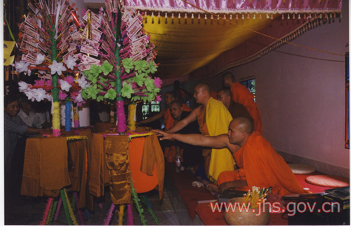 1.賧帕:在傣歷一月八日做佛事三天。賧布給和尚做袈裟,以結(jié)婚夫婦計(jì)算,每對夫婦出黃布二 。