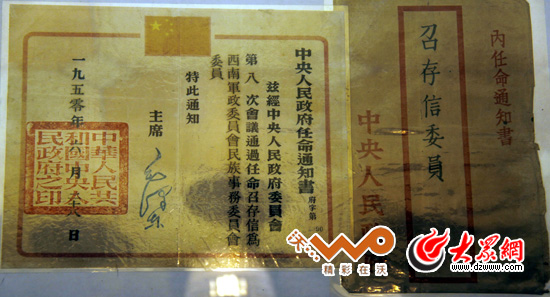 由毛澤東親自簽發的任命召存信為西雙版納自治州州長的委任書