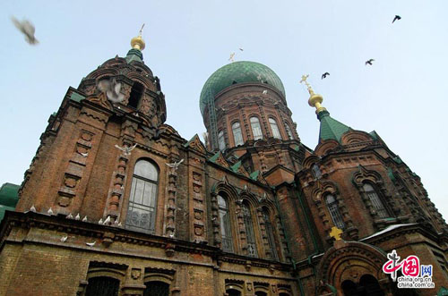 索菲亞教堂始建于1907年3月,她原來是西伯利亞步兵師修建的隨軍教堂,原為木質結構,規模較小,隨著東正教徒的增加,1923年9月索菲亞教堂在現在地方進行了重建,1932年11月竣工,歷時9年。教堂全高53.35米,占地面積721平方米,教堂外觀富麗堂皇,典雅脫俗,是拜占庭式建筑的典型代表。