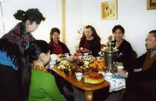 飲宴之余,人們還要舉行室外聚會(huì)。能歌善舞的青年人拉起手風(fēng)琴,彈起三角琴和吉它,唱著悠揚(yáng)的俄羅斯民歌,跳起節(jié)奏強(qiáng)烈的踢踏舞。在不斷地相互邀請(qǐng)下,男女老幼齊登場(chǎng),聚會(huì)頓時(shí)成了歡樂(lè)的海洋。