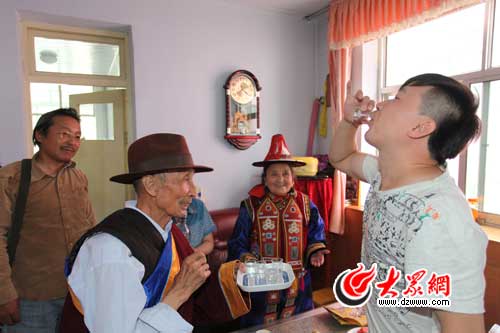 大眾網-聯通3G甘肅8月7日報道(特約記者 施曉亮)九年前采訪安天祿、杜桂英夫婦時,他們還住在城南那套帶小院的平房里,安大爺杜大媽與兒女們身著裕固族盛裝,為我們敬酒、唱堯乎爾民歌。九年后,雖然大爺大媽搬進了樓房,但裕固族傳統(tǒng)禮節(jié)一樣不少,事先得到我們要來訪消息的老兩口盛裝相迎,并且親執(zhí)酒壺,以堯乎爾傳統(tǒng)的三杯酒相敬。在他們心中,傳統(tǒng)就是傳統(tǒng),堯乎爾的禮儀和情感是一點不能摻水的。
