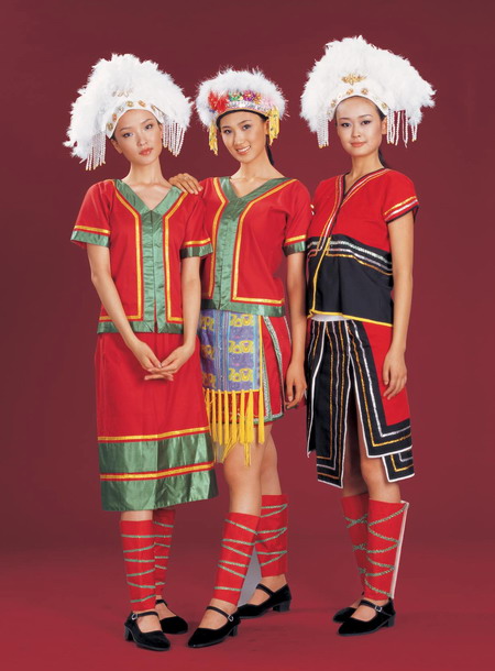 1、泰雅、賽夏、曹、阿美地區的女子多穿對襟長袖上衣,配腰裙,戴護腿。泰雅、賽夏的女子穿單裙,朱歐女子穿左右雙合裙。排灣、阿美女子穿長裙。布衣、排灣、魯凱女子用黑、紅布纏頭,外箍彩繡頭帶,穿大襟衣,右衽,左右開衩都很高,配褲子。雅美女子穿背心,圍腰布,冬天用方布圍裹,并在左肩打結。大陸的高山族女子穿對襟衣,內有胸襯,配筒裙,頭戴紅或紫色軟布花環。喜慶日子里高山族男女都穿盛裝,其衣裙褲帶五彩斑駁,腿部和衣物上佩戴貝珠、料珠、銀、骨、羽毛等飾品,有的還穿珠裙、貝衣等。