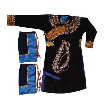 2、以布農、魯凱和排灣人為主的長衣下裳式:其特點為上身穿窄袖上衣,在袖與肩的部位有滾邊的刺繡,下穿圍裙膝褲,以黑布或紅布纏頭,跣足。