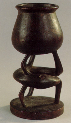 這是用整塊木料雕成的一個杯子,情趣盎然。它上面是一個小杯,底座和杯身間刻著一條蛇,形成一個透空,似乎蛇在撐地托杯,構思奇特。