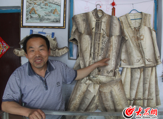 孫玉林向記者介紹自己制作的魚皮衣,兩件魚皮衣要用上數(shù)十條大馬哈魚的魚皮。