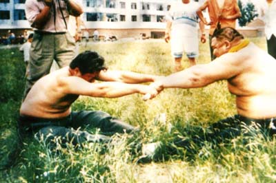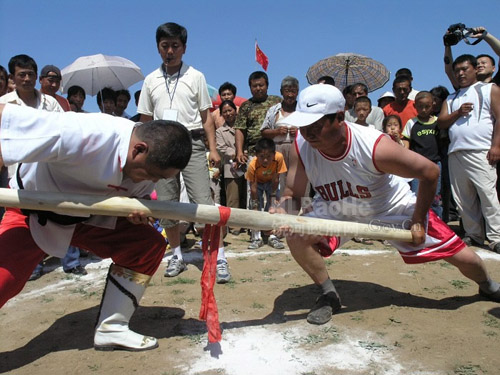 “拉杠”,也是傳統(tǒng)的競技項(xiàng)目,是力的較量,不論男女均可參加,多在漁獵的網(wǎng)灘、獵場休憩時或吉慶的日子舉行。比賽時二人一平地頂腳對坐,二人雙手橫拉木棍,一方將另一方拉起即判獲勝。
