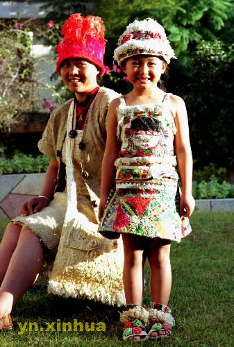 這套樹皮童裝(前)是張樹皮2003年縫制的,并在當年9月舉行的云南民族風格賽裝節上獲銀獎。