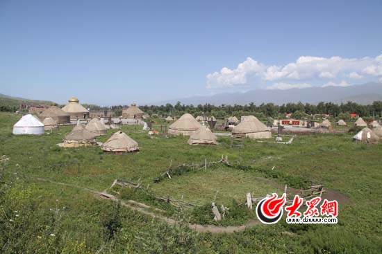 “草原部落”景區里還原的古烏孫國場景,散落著大大小小的白色氈房。