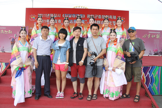 采訪團在采訪朝鮮族歌舞時和趙本躍合影留念(左二為趙本躍)