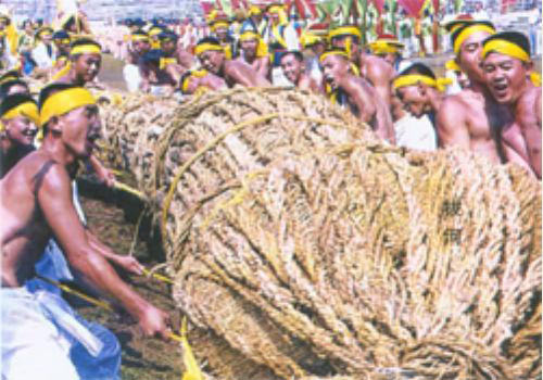 朝鮮族在民間舉行拔河游戲的歷史很長。早在15 世紀已盛行拔河比賽。過去,每逢正月十五,人們以村為單位進行拔河比賽。這一天,一早開始就熱鬧異常,方圓數十里的農民,各自組織農樂隊從四面八方涌來聚集在拔河賽場上,載歌載舞,鑼鼓喧天。中午時分,雙方壯丁各自扛著自己的繩子,進入賽場分界線接繩。拔河繩分“雄繩”和“雌繩”,連結時把雄繩尖頭插入雌繩圈頭里,然后插上大木簪子固定。隨著裁判員的一聲令下,全場群情激昂,助威吶喊。雷鳴般的呼叫聲,鑼鼓聲,響徹云霄。比賽結束后,取勝的一方隊員扛著拔河繩子,在農樂隊的助興下,歡天喜地凱旋回村。全村男女老幼,又載歌載舞,夾道歡迎,慶祝勝利。
